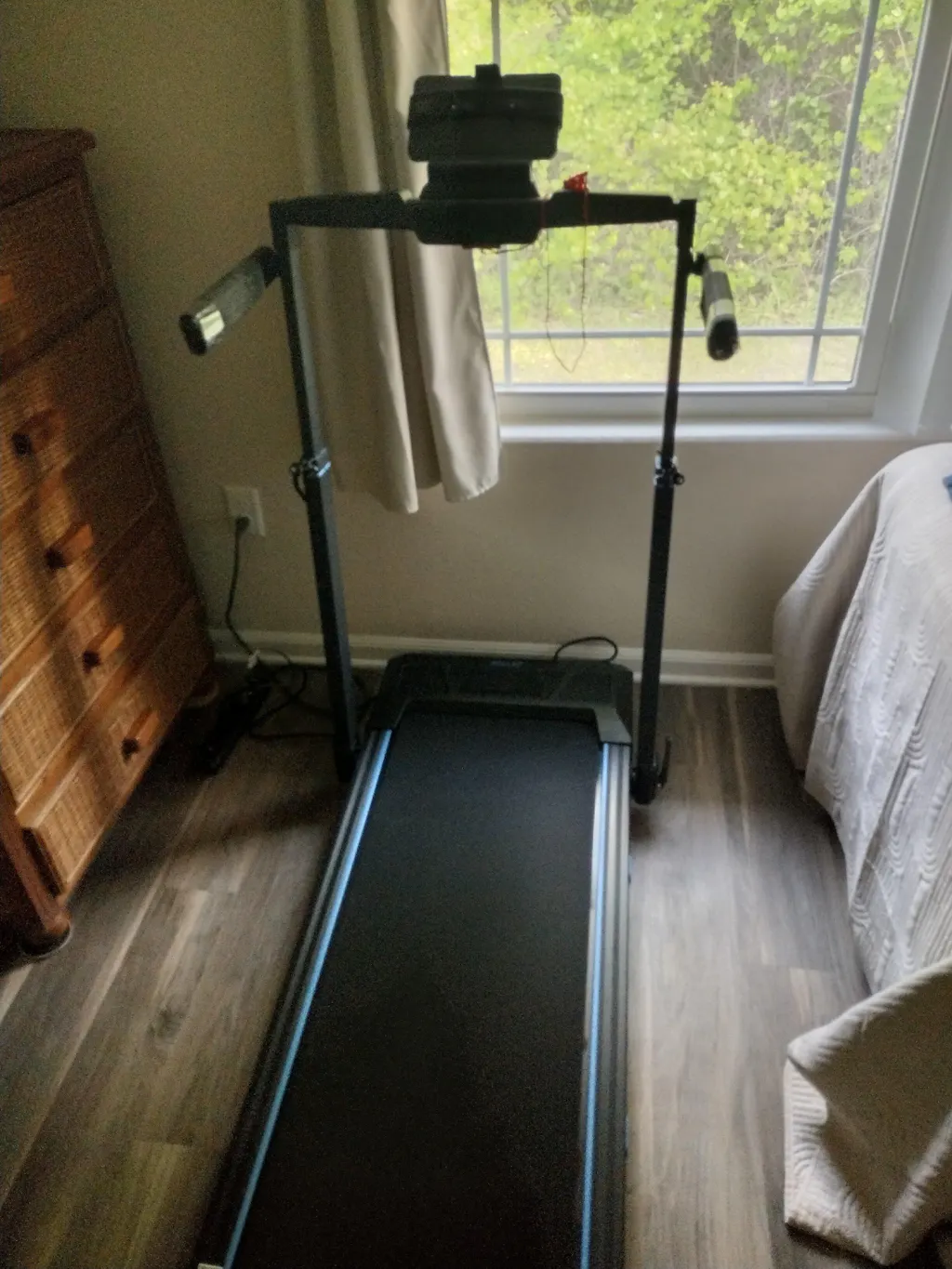 This compact treadmill fits in tight spaces and offers an ideal exercise solution for those with limited home space. it can be easily moved and placed under the bed, under the locker when not in use; Controlled with a remote, its 3.5 HP motor features a whisper-quiet brusehless motor, and can easily be adjusted to meet a variety of fitness goals.